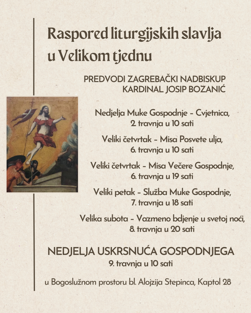 Zagreb, (IKA) – Zagrebački nadbiskup kardinal Bozanić predvodit će misno slavlje Nedjelje Uskrsnuća Gospodnjega 9. travnja u 10 sati u Bogoslužnom prostoru bl. Alojzija Stepinca, Kaptol 28, najavio je Tiskovni ured Zagrebačke nadbiskupije.