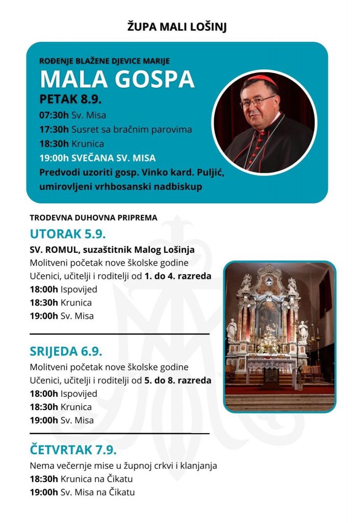 Mali Lošinj, (IKA) – Župa Rođenja Blažene Djevice Marije u Malom Lošinju proslavit će u petak 8. rujna nebesku zaštitnicu Malu Gospu. U 17.30 će biti susret s bračnim parovima. Slijedi krunica u 18.30. Svečanu misu u 19 sati predvodit će umirovljeni vrhbosanski nadbiskup kardinal Vinko Puljić. Jutarnja misa slavit će se u 7.30 sati.