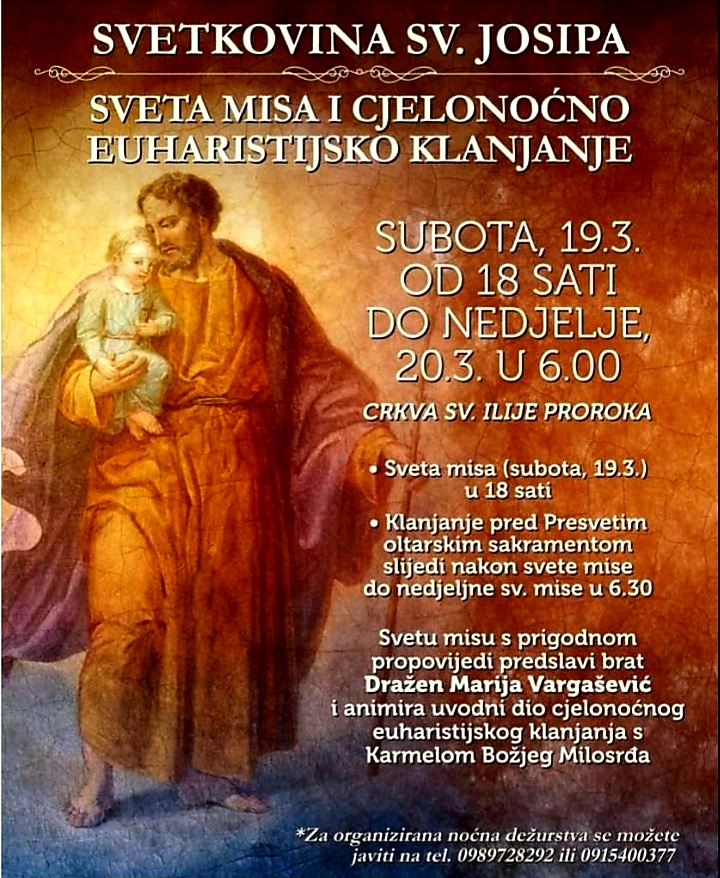 Na svetkovinu sv. Josipa, u subotu 19. ožujka br. Dražen Marija Vargašević predslavit će misu u crkvi sv. Ilije u Metkoviću u 18 sati a potom animirati uvodni dio cjelonoćnog klanjanja sa Karmelom Božjeg Milosrđa. Misu i klanjanje animira i bend Župe.