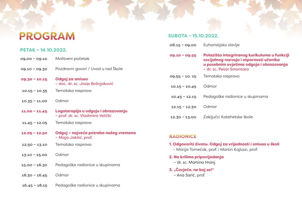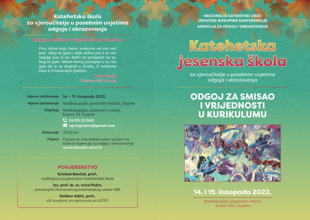 Katehetska jesenska škola za vjeroučitelje u posebnim uvjetima odgoja i obrazovanja će se održati 14. i 15. listopada u prostorima Nadbiskupijskog pastoralnog instituta u Zagrebu.
