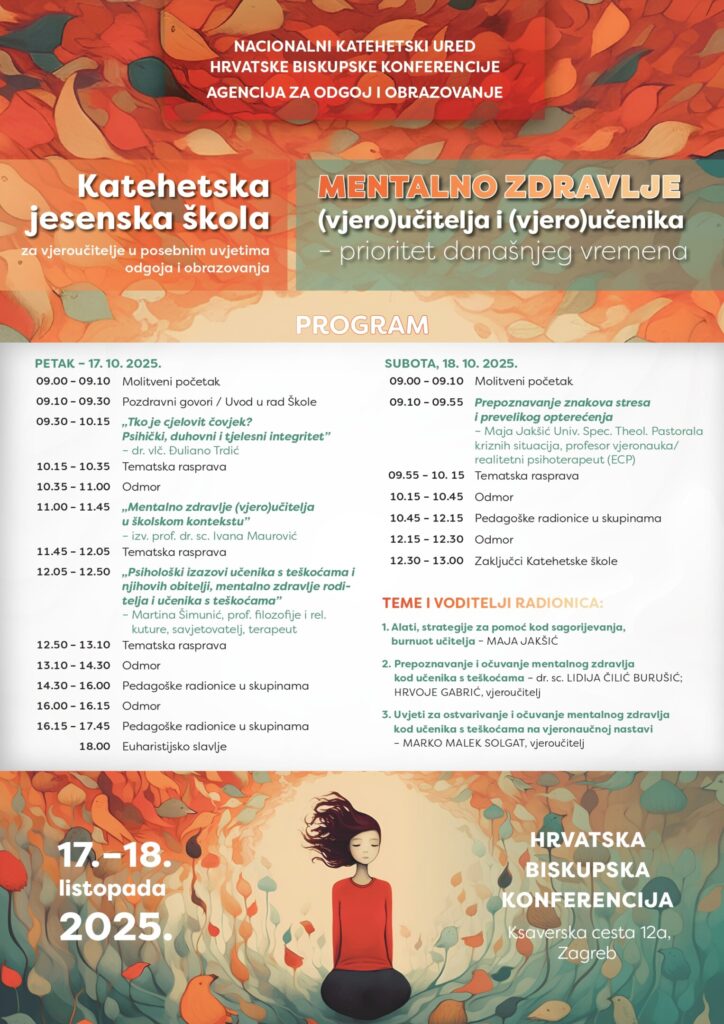 U organizaciji Nacionalnog katehetskog ureda Hrvatske biskupske konferencije i Agencije za odgoj i obrazovanje održat će se Katehetska jesenska škola za vjeroučitelje u posebnim uvjetima odgoja i obrazovanja, od 17. do 18. listopada godine u Zagrebu na adresi Ksaverska cesta 12a.