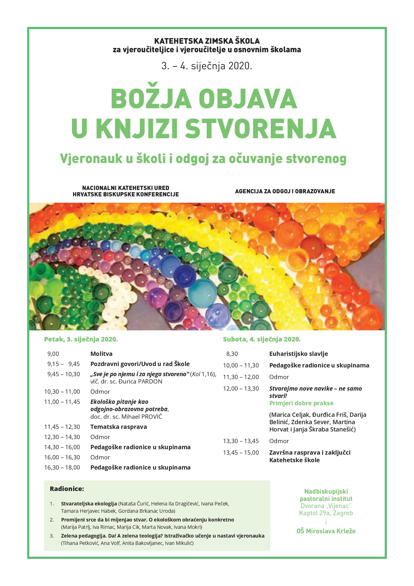 Zagreb, (IKA) – Katehetska zimska škola za vjeroučiteljice i vjeroučitelje u osnovnim školama o temi „Božja objava u Knjizi stvorenja. Vjeronauk u školi i odgoj za očuvanje stvorenog“ održat će se 3. i 4. siječnja u Nadbiskupijskome pastoralnom institutu u Zagrebu i OŠ Miroslav Krleže. Organizatori su Nacionalni katehetski ured HBK i Agencija za odgoj i obrazovanje.