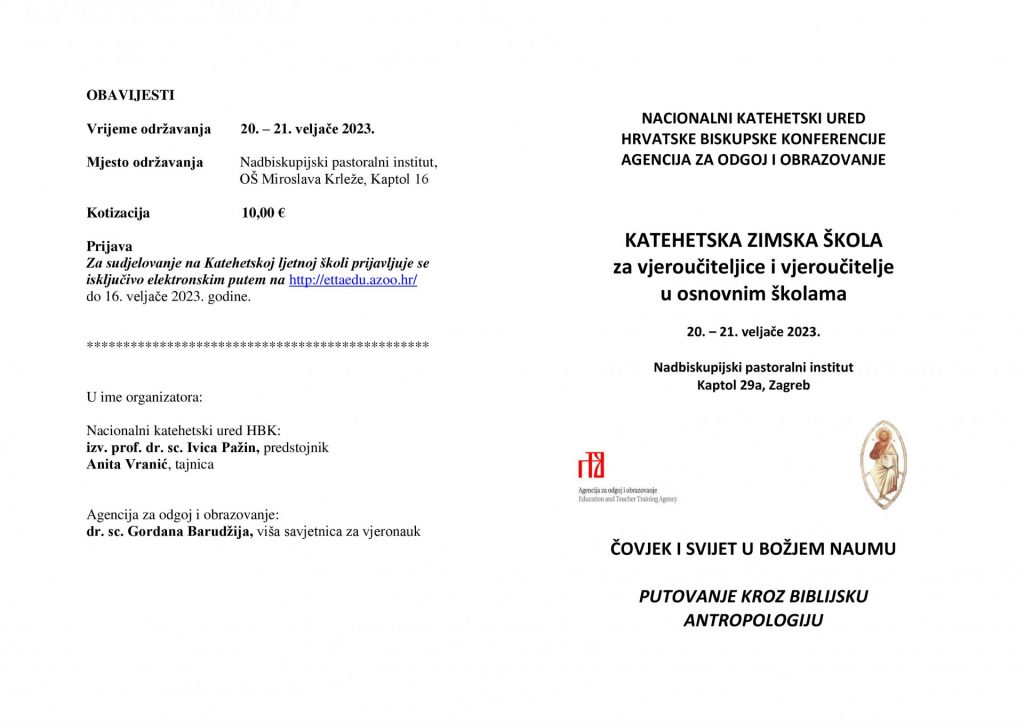 Zagreb, (IKA) – „Čovjek i svijet u Božjem naumu – Putovanje kroz biblijsku antropologiju“ bit će tema Katehetske zimske škole za vjeroučiteljice i vjeroučitelje u osnovnim školama koja će se održati 20. i 21. veljače u Nadbiskupijskome pastoralnom institutu u Zagrebu.