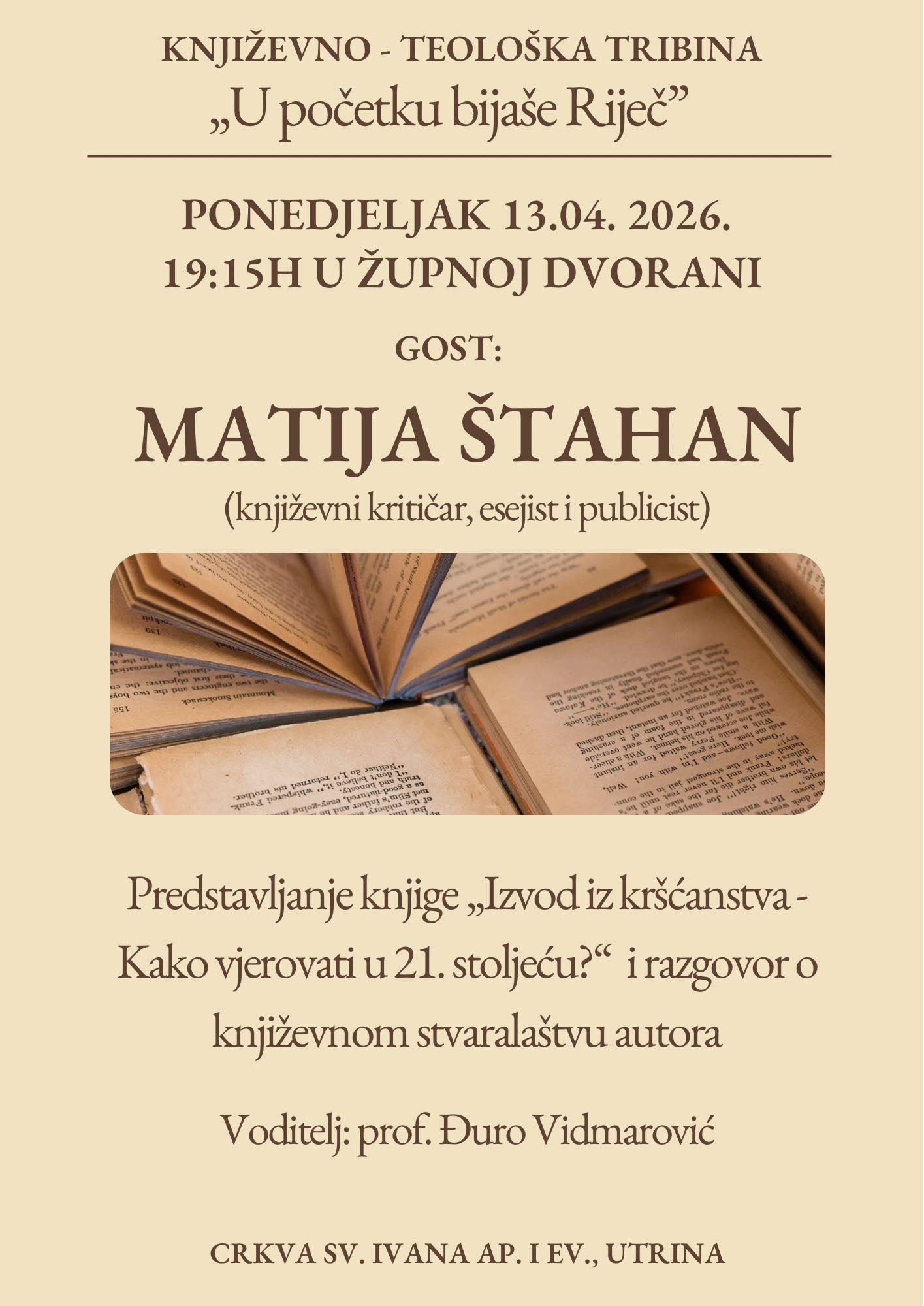 U sklopu književno-teološke tribine „U početku bijaše Riječ“, u ponedjeljak, 13. travnja s početkom u 19.15 sati, u župnoj dvorani crkve Sv. Ivana apostola i evanđelista u zagrebačkim Utrinama održat će se susret s Matijom Štahanom, književnim kritičarom, esejistom i publicistom.