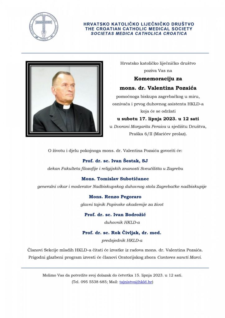 Zagreb, (IKA) – Hrvatsko katoličko liječničko društvo organizira komemoraciju za mons. dr. Valentina Pozaića, zagrebačkog pomoćnoga biskupa u miru, osnivača i prvog duhovnog asistenta HKLD-a, koja će se održati u subotu 17. lipnja u 12 sati u Dvorani Margarita Peraica u sjedištu Društva, Praška 6/II (Marićev prolaz).