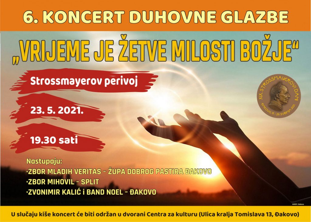 U okviru 19. Strossmayerovih dana, 23. svibnja u 19.30 u Perivoju Josipa Jurja Strossmayera (velikom parku) bit će održan 6. koncert duhovne glazbe „Vrijeme je žetve milosti Božje“. Ove godine na koncertu će nastupiti: