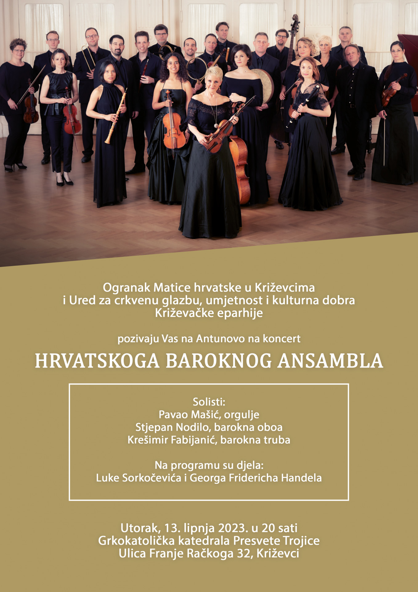 Ogranak Matice hrvatske u Križevcima i Ured za crkvenu glazbu, umjetnost i kulturna dobra Križevačke eparhije organiziraju koncert 13. lipnja Hrvatskog baroknog ansambla u grkokatoličkoj katedrali Presvete Trojice s početkom u 20 sati.