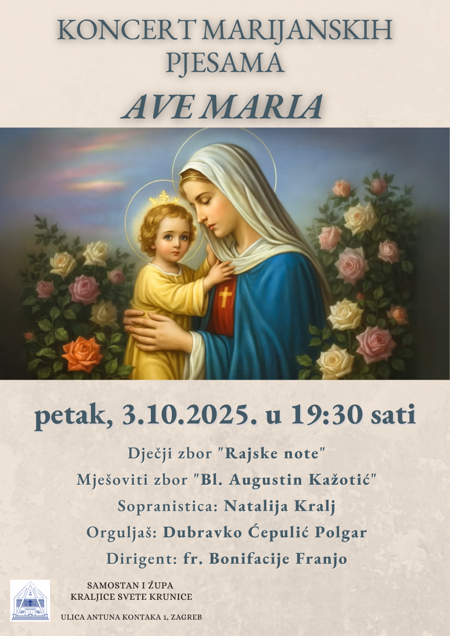 Koncert marijanskih pjesama "Ave Maria" Ispis Zagreb (IKA) 03.10.2025. / 19:30 Koncert marijanskih pjesama “Ave Maria” održat će se u petak, 3. listopada u samostanu i župi Kraljice Svete Krunice u Zagrebu. Početak koncerta je u 19.30 sati. Podijeli članak