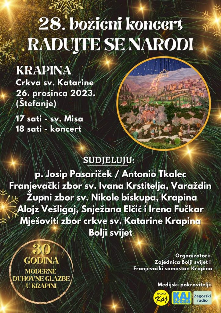Božićni koncert „Radujte se narodi“ održat će se u utorak, 26. prosinca 2023. u crkvi sv. Katarine u Krapini s početkom u 18 sati. Prije koncerta u 17 sati bit će slavljena misa.