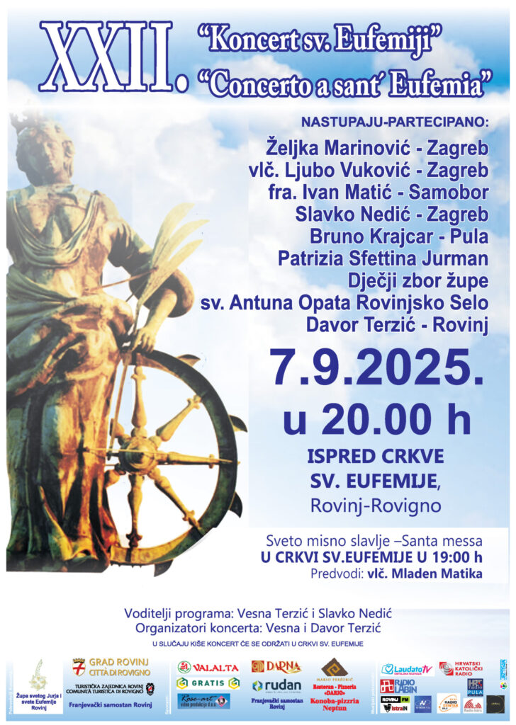 Tradicionalni 22. „Koncert sv. Eufemiji“ bit će održan u nedjelju 7. rujna u 20 sati ispred crkve sv. Eufemije u Rovinju.