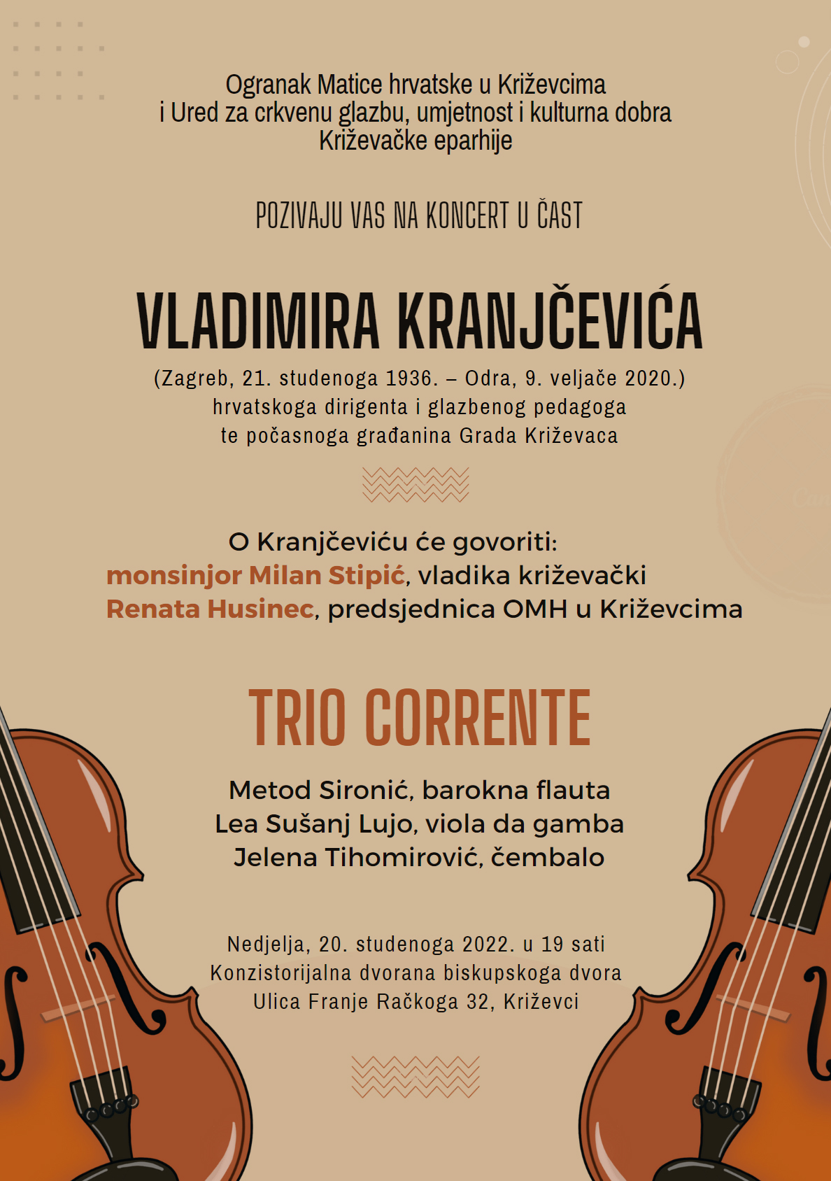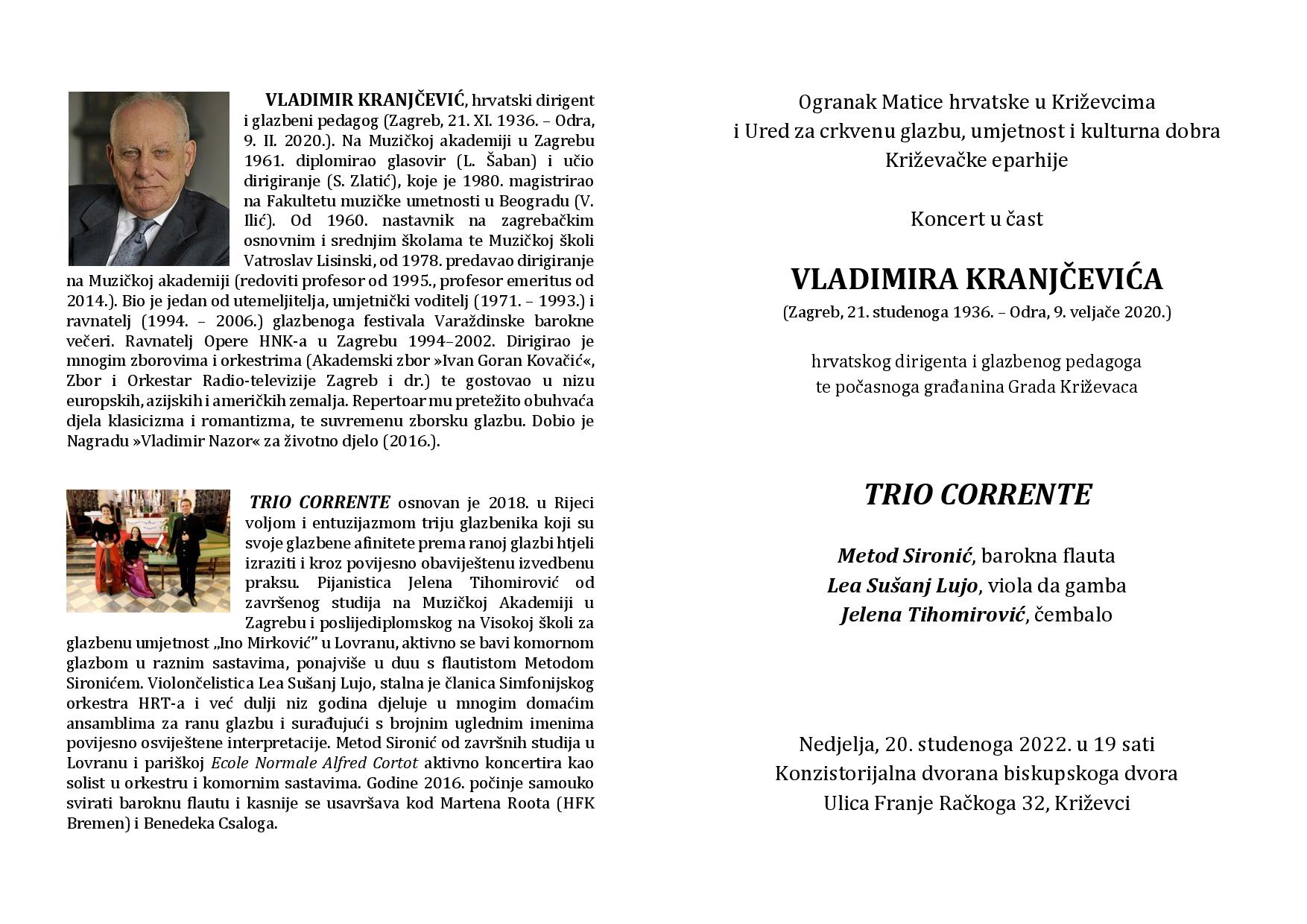 Ogranak Matice hrvatske u Križevcima i Ured za crkvenu glazbu, umjetnost i kulturna dobra Križevačke eparhije priređuju koncert u čast VLADIMIRA KRANJČEVIĆA, proslavljenog hrvatskog dirigenta i glazbenog pedagoga te počasnog građanina Grada Križevaca.