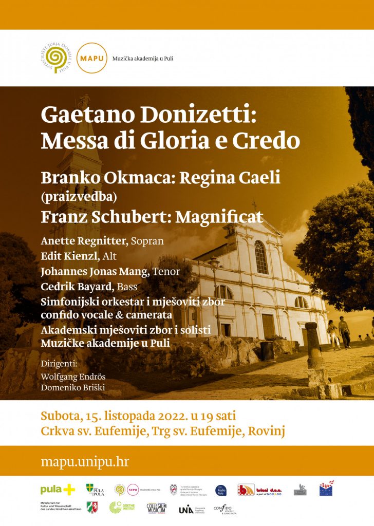 Program koncerta sastavljen je od djela kompozitora iz tri države članice Europske unije: Italije, Njemačke i Hrvatske. Na koncertu će se praizvesti oratorijsko djelo napisano za tu priliku, istarskog skladatelja i profesora na Muzičkoj akademiji u Puli, Branka Okmace – Regina Caeli za simfonijski orkestar i zbor, te F. Schubert – Magnificat i G. Donizetti – Messa di gloria e credo.