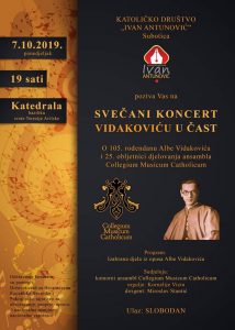 Katoličko društvo “Ivan Antunović” iz Subotice priređuje u ponedjeljak 7. listopada u 19 sati svečani koncert “Vidakoviću u čast” o 105. obljetnici rođenja Albe Vidakovića i 25. obljetnici djelovanja ansambla Collegium Musicum Catholicum. Na programu će biti izabrana djela skladatelja Albe Vidakovića koje će izvoditi ovaj zbor koji ove godine proslavlja četvrt stoljeća rada, uz orguljsku pratnju Kornelija Vizina i ravnanje Miroslava Stantića. Koncert, čije su održavanje pomogli Središnji državni ured za Hrvate izvan Republike Hrvatske i Pokrajinsko tajništvo za obrazovanje, upravu, propise i nacionalne zajednice, bit će održan u katedrali-bazilici sv. Terezije Avilske u Subotici.
