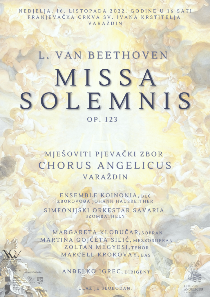 Zbor Chorus angelicus će 16. listopada izvesti Missu Solemnis Ludviga van Beethovena. Koncert će se održati u franjevačkoj crkvi sv. Ivana Krstitelja u Varaždinu u 16 sati.