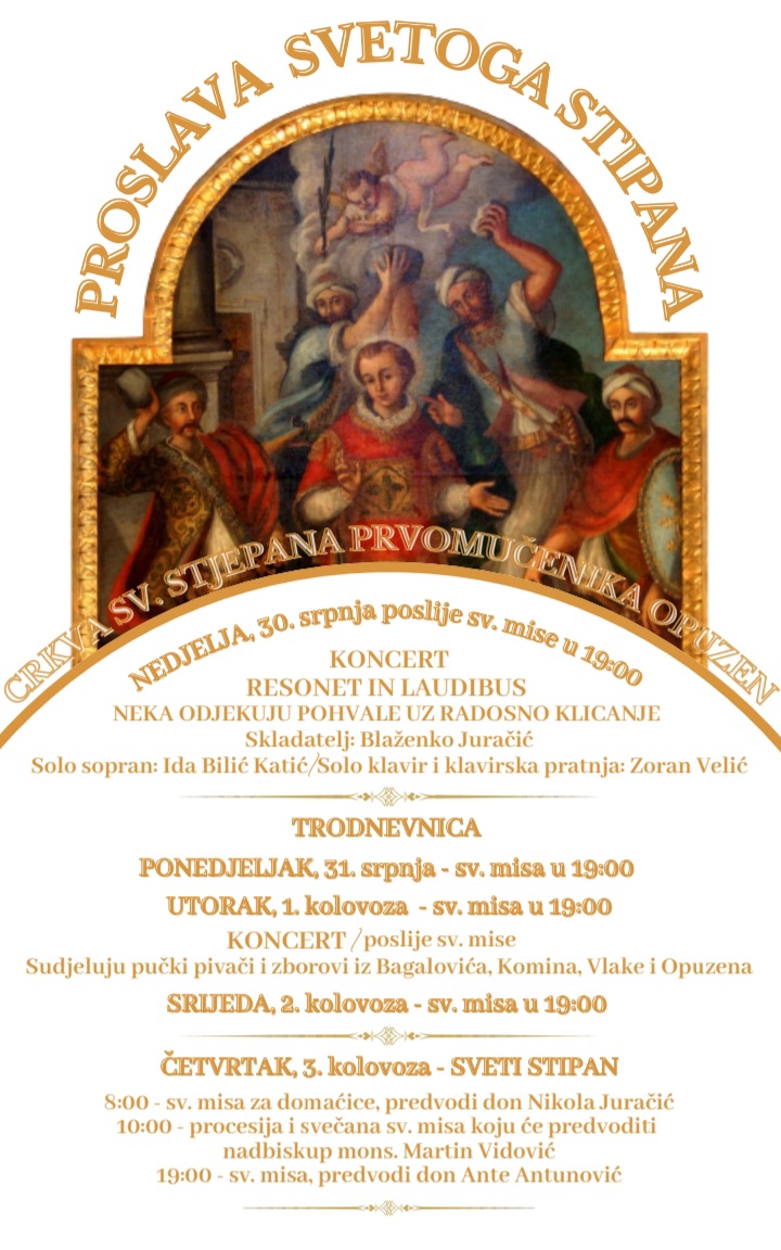 U crkvi Sv. Stjepana u Opuzenu u nedjelju 30. srpnja nakon večernje mise u 19 sati održat će se koncert pod naslovom “Resonet in laudibus”. Skladatelj je Blaženko Juračić,