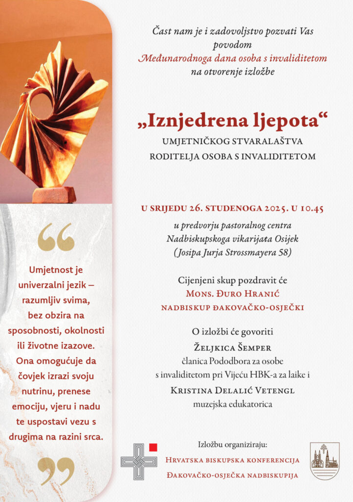 U 10:45 u predvorju pastoralnog centra Vikarijata bit će otvorena izložba „Iznjedrena ljepota“, koja predstavlja umjetnička djela roditelja osoba s invaliditetom.
