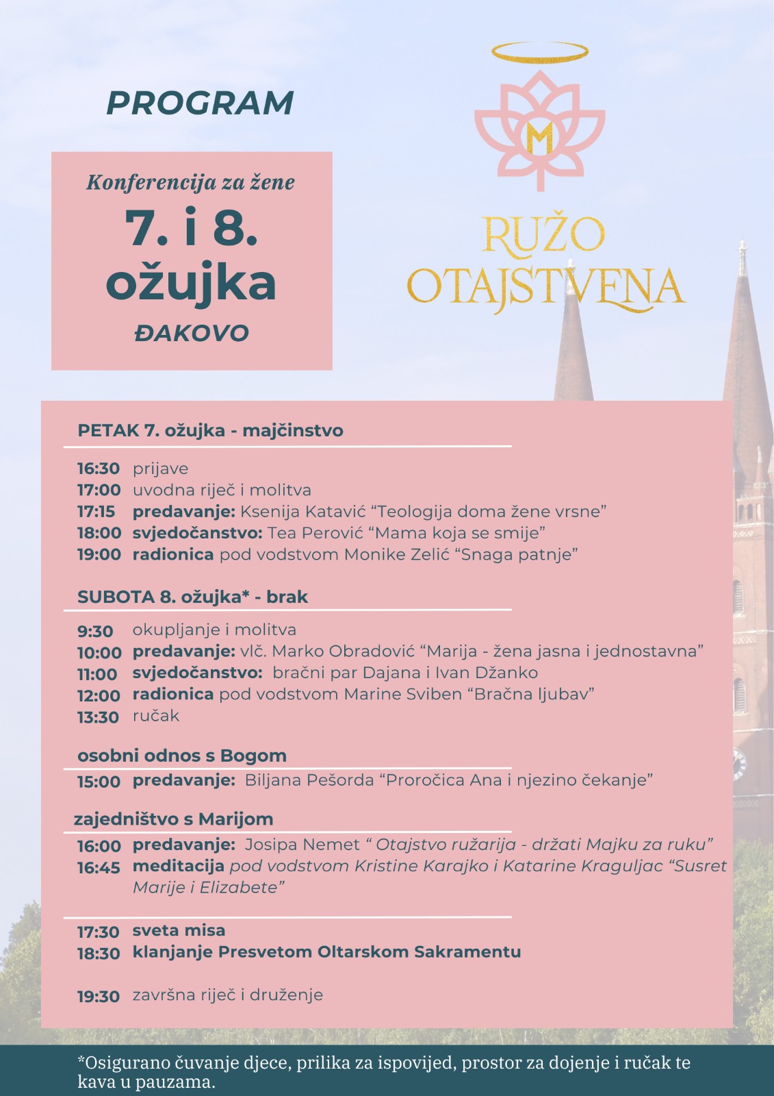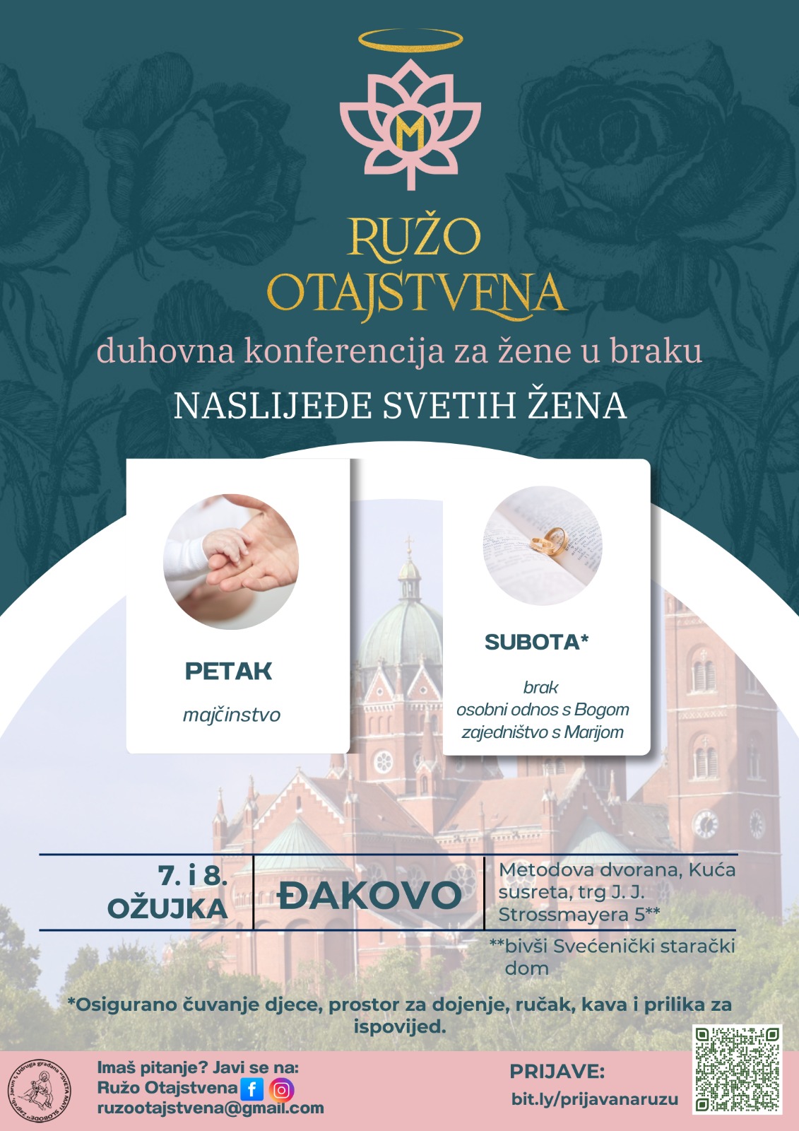 Konferencija za žene u braku „Ružo otajstvena“ s temom Nasljeđe svetih žena održava se 7. i 8. ožujka u Đakovu, u Metodovoj dvorani „Kuće susreta“ (Trg J. J. Strossmayera 5 – bivši Svećenički dom). Program započinje u petak, 7. ožujka s prijavama od 16.30, a nastavlja se molitvom i predavanjima na temu majčinstva. Program u subotu, 8. ožujka započinje okupljanjem u 9.30, slijedi molitva te predavanja na temu braka, osobnog odnosa s Bogom i zajedništva s Marijom. Tijekom programa bit će prilika za ispovijed. Konferencija će biti zaključena misom i klanjanjem te druženjem. Tijekom konferencije osigurano je čuvanje djece, prostor za dojenje, ručak i kava, a detaljan program i QR kod za prijavu nalazi se na plakatima, FB ili IG stranicama “Ružo Otajstvena”.