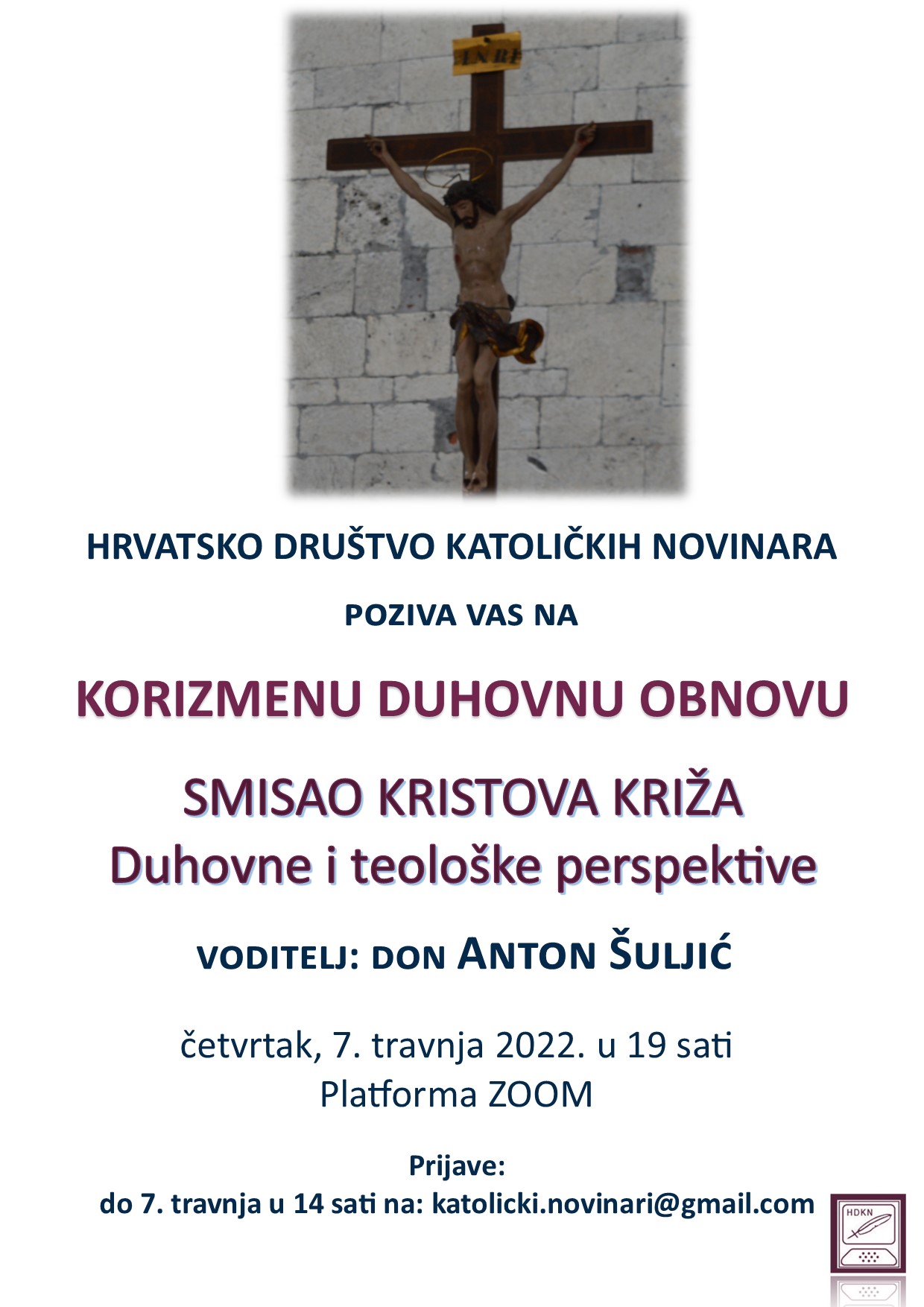 Hrvatsko društvo katoličkih novinara organizira u četvrtak 7. travnja s početkom u 19 sati korizmenu duhovnu obnovu s temom „Smisao križa: duhovne i teološke perspektive“. Obnovu će voditi don Anton Šuljić, član Društva.