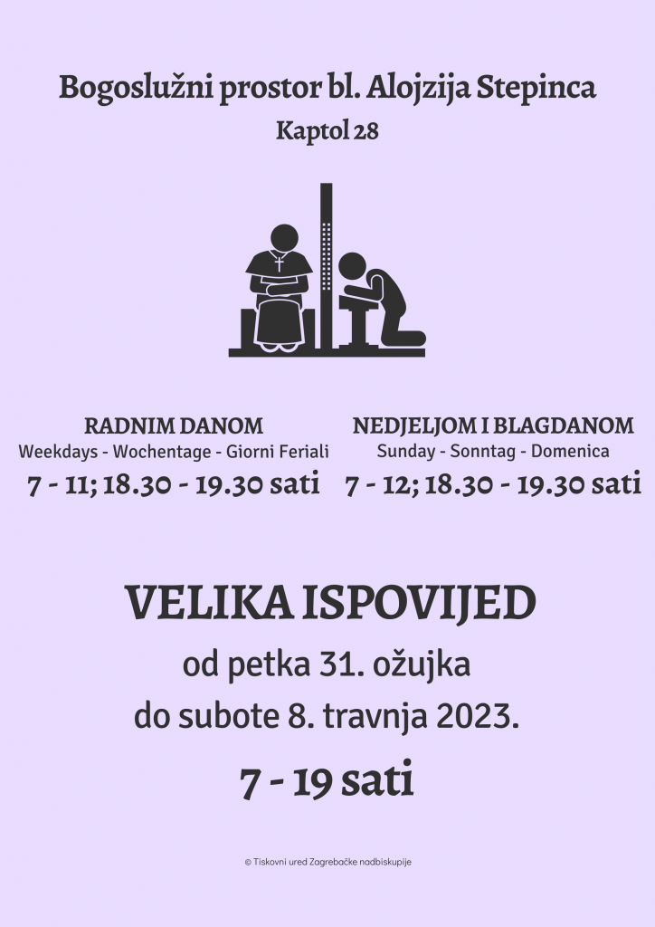 Velika korizmena ispovijed u Bogoslužnom prostoru bl. Alojzija Stepinca u Zagrebu, Kaptol 28, održavat će se od petka 31. ožujka do subote 8. travnja od 7 do 19 sati.