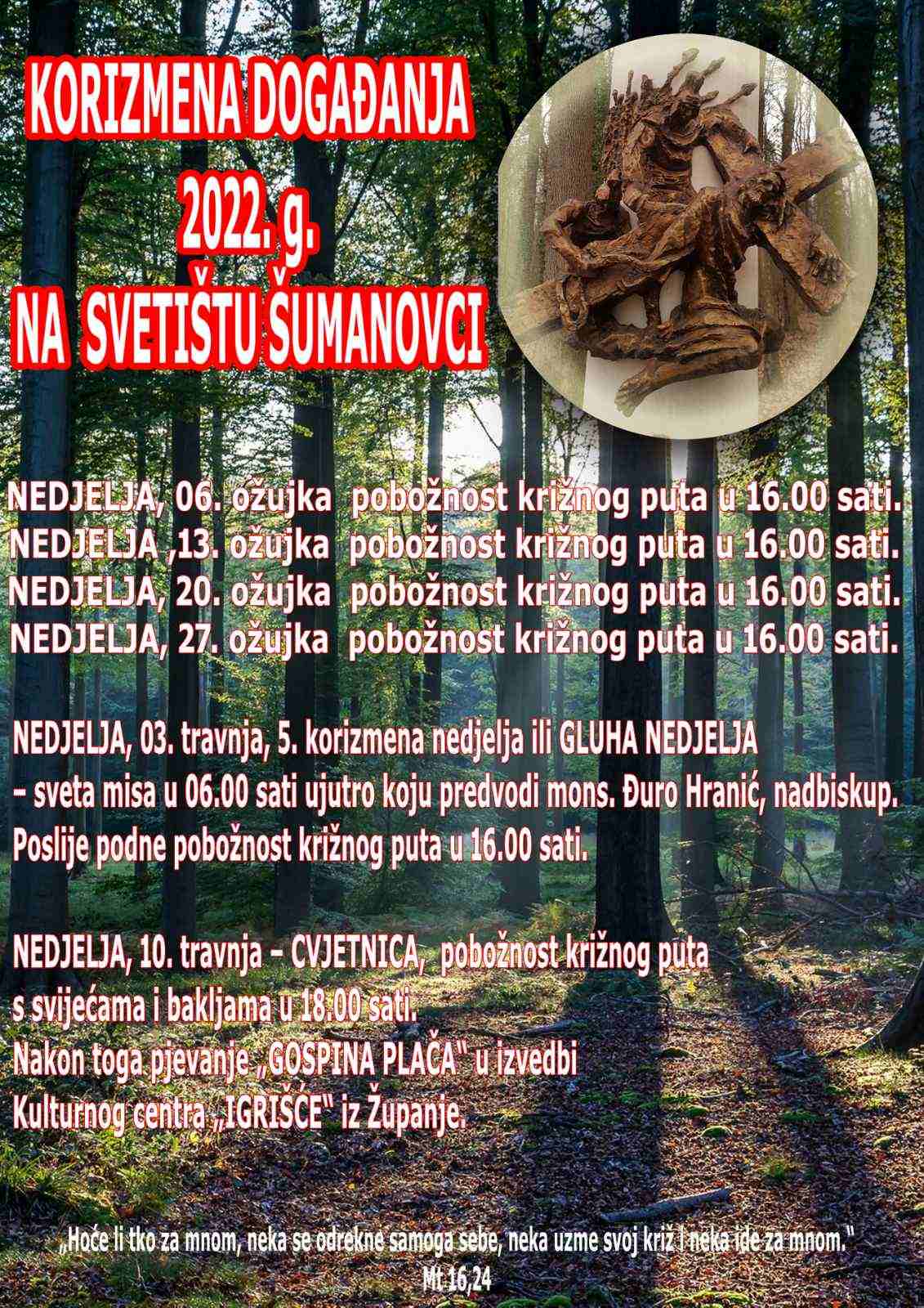 Kako su se vjernici i do sada svake godine korizmenim nedjeljama okupljali u prostoru svetišta na pobožnosti križnoga puta, to će nastaviti i tijekom ove korizme, svake nedjelje u 16 sati, i to pred 15 novopostavljenih postaja u šumi.