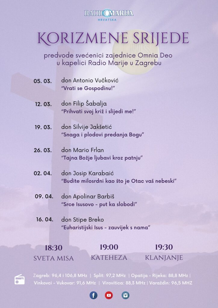 Svake korizmene srijede duhovni program počinje misom u 18:30 sati u kapelici Navještenja Marijina na Kamenitom stolu 11 u Zagrebu, nastavlja se katehezom na odabrane teme u 19 sati te klanjanjem Presvetom Oltarskom Sakramentu u 19:30 sati.