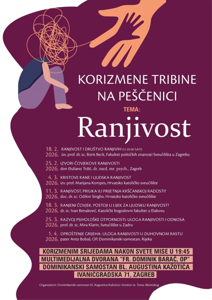 Korizmene tribine srijedom na Peščenici počinju na Pepelnicu 18. veljače u 20 sati, nakon večernje mise, u dvorani „Fr. Dominik Barač – dominikanac, mučenik“ Dominikanskog samostana bl. Augustina Kažotića u Zagrebu na Peščenici, Ivanićgradska 71 (na raskrižju s Vukovarskom ulicom). Tema ovogodišnjih tribina je ranjivost. Na prvo tribini pod naslovom „Ranjivost i društvo ranjivih“ govorit će dr. Boris Beck, profesor novinarstva na Fakultetu političkih znanosti Sveučilište u Zagrebu, pisac, novinar, urednik, publicist, redaktor novog prijevoda Biblije.