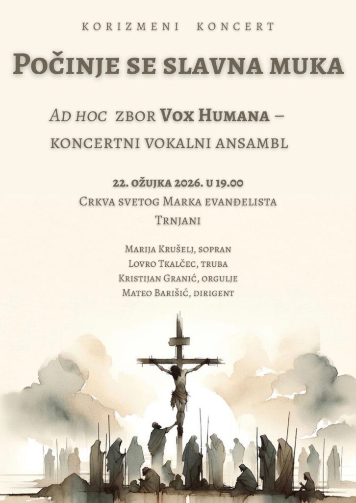 Korizmeni koncert „Počinje se slavna muka“ ad hoc zbora „Vox humana“, koncertnog vokalnog ansambla, održat će se u nedjelju 22. ožujka s početkom u 19 sati u crkvi sv. Marka evanđelista u Trnjanima.