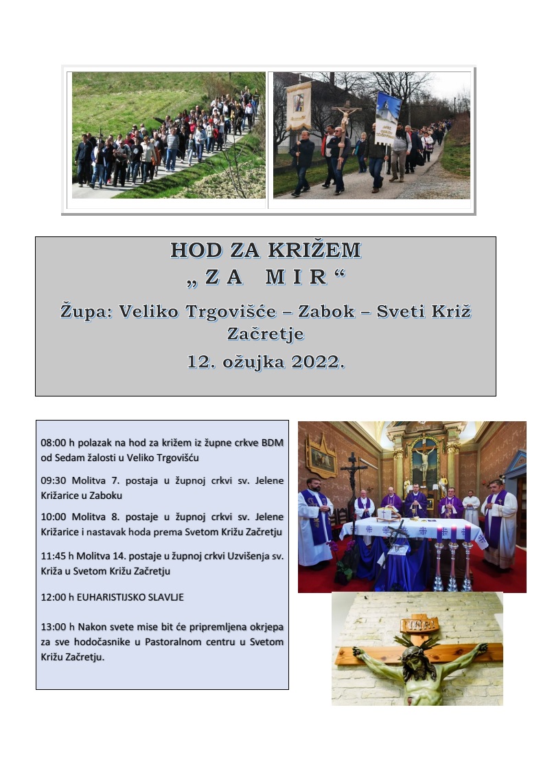 I ove godine župe Krapinskog dekanata organiziraju korizmeni križni put “Hod za mir” koji obuhvaća njihove župe. Krenut će se u subotu 12. ožujka u 8 sati iz župne crkve BDM od Sedam Žalosti u Velikom Trgovišću prema Zaboku gdje će u 10 sati biti izmoljena osma postaja križnog puta nakon koje će se nastaviti hod prema Svetom Križu Začretju. U 11.45 sati predviđa se dolazak u župnu crkvu Uzvišenja Svetog Križa gdje će biti izmoljena 14. postaja križnog puta te će zatim uslijediti misno slavlje. Nakon svete mise u 13 sati bit će pripremljena okrjepa za sve hodočasnike u Pastoralnom centru u Svetom Križu Začretju.
