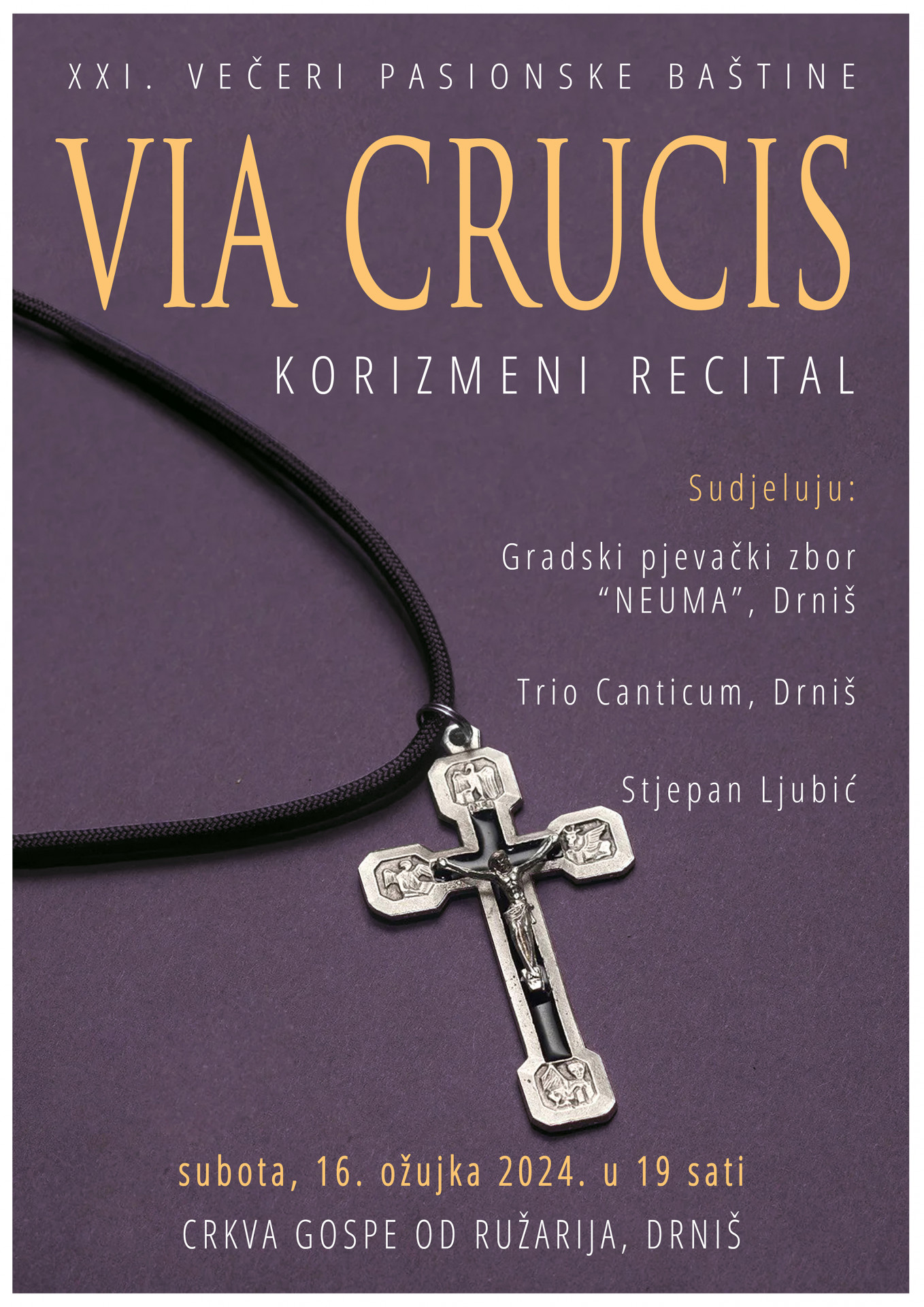 Program se odvija u sklopu drniških XXI. Večeri pasionske baštine. Tradicionalne hrvatske korizmene napjeve uz autorske skladbe, uz zbor će izvesti Trio Canticum, a cjelokupni korizmeni ugođaj bit će upotpunjen izvedbom poetskog prikaza križnog puta, Via crucis, autorice hrvatske pjesnikinje Anke Petričević (klarise sestre Marije od Presvetog Srca) u interpretaciji Stjepana Ljubića. Koncert počinje u 19 sati.
