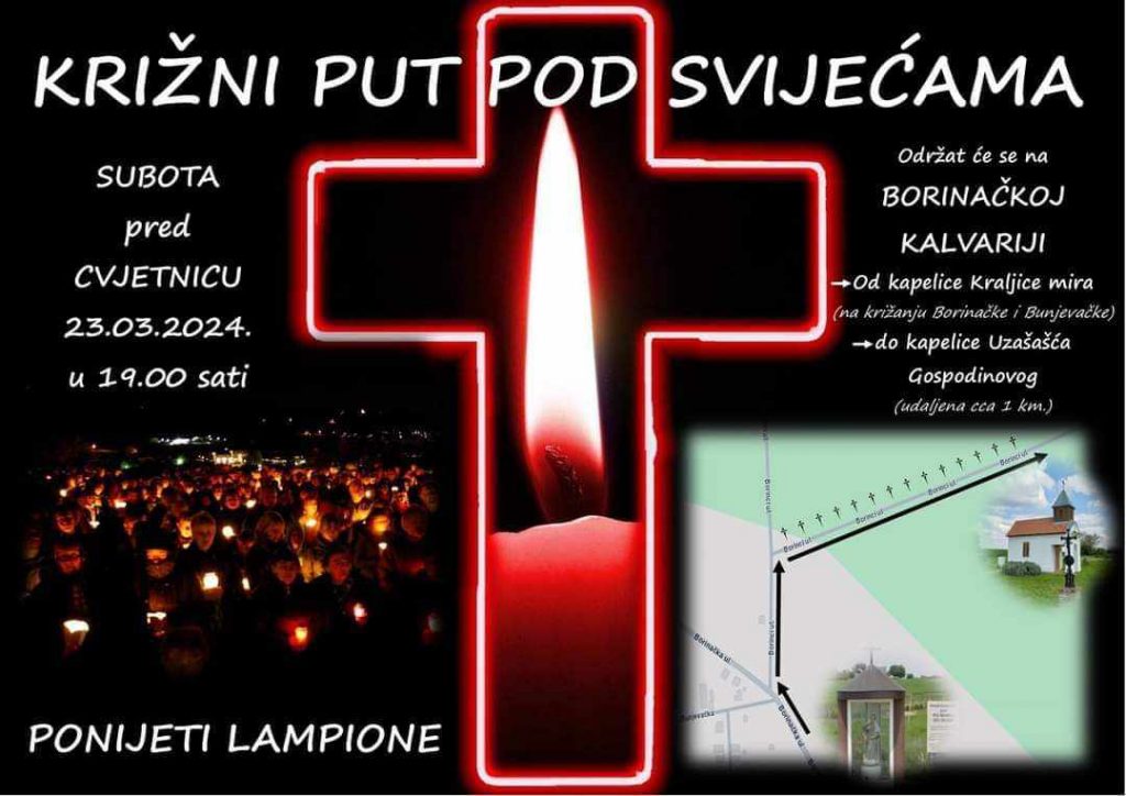 Križni put pod svijećama bit će održan u subotu 23. ožujka 2024. u 19 sati na borinačkoj Kalvariji u Vinkovcima.