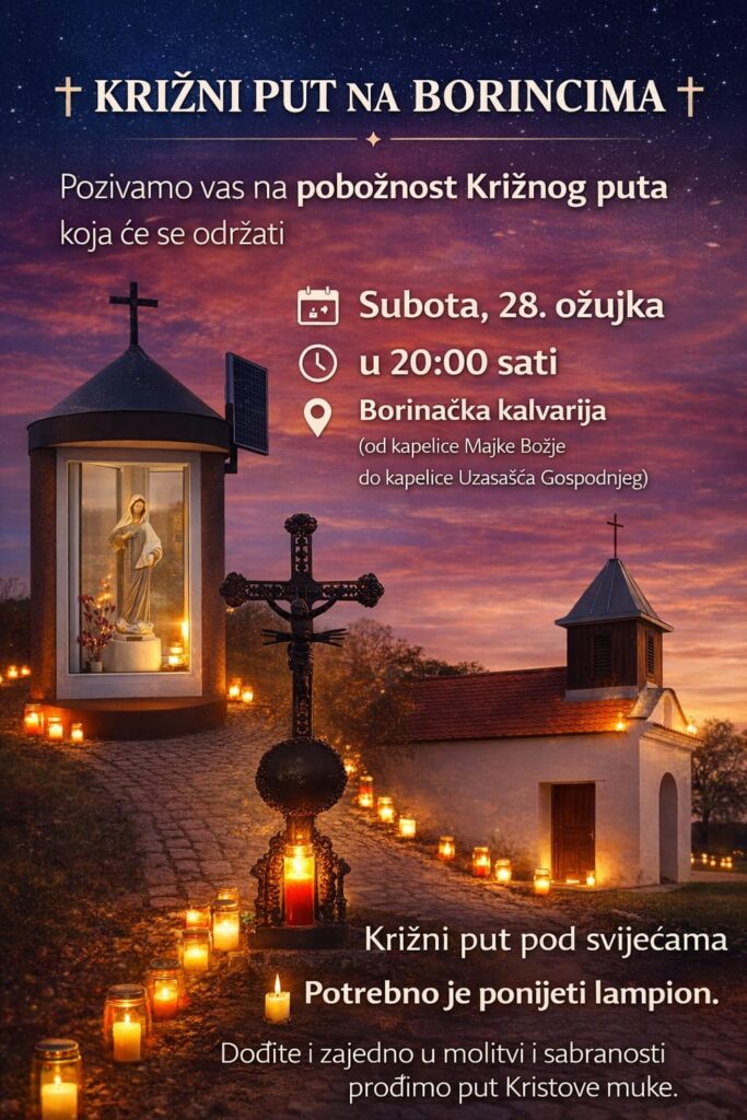 Križni put pod svijećama održat će se u subotu 28. ožujka u 20 sati na borinačkoj Kalvariji u Vinkovcima.