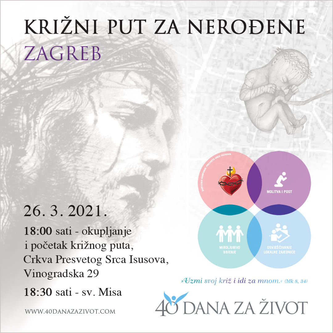 U bolničkoj župnoj crkvi Presvetog Srca Isusova u sklopu Kliničkog bolničkog centra Sestre milosrdnice u Vinogradskoj ulici u petak 26. ožujka u 18 sati održat će se križni put za nerođene u organizaciji udruge 40 dana za život.