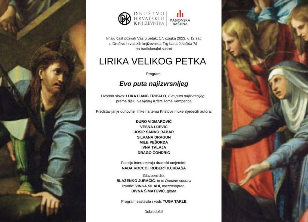 Društvo hrvatskih književnika u okviru 32. svečanosti Pasionska baština organizira susret Lirika Velikog petka „Evo puta najizvrsnijeg“ u svojim prostorima na Trgu bana Josipa Jelačića 7 u Zagrebu, u petak 17. ožujka 2023. u 12 sati.
