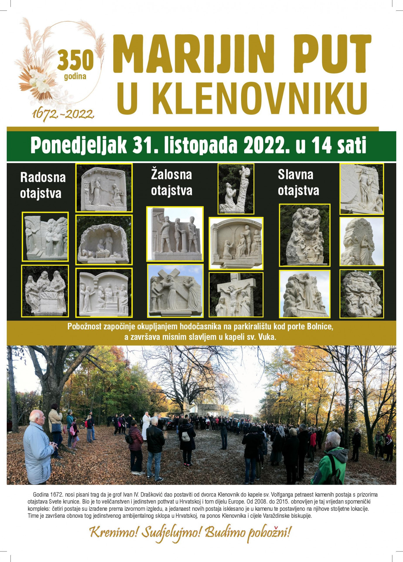 Marijin put u Klenovniku započinje u nedjelju 31. listopada u 14 sati okupljanjem na parkiralištu kod porte Bolnice za plućne bolesti i TBC. Okupljene hodočasnike pozdravit će uime organizatora, Župe Presvetoga Trojstva u Klenovniku, klenovnički župnik Josip Jagarčec.