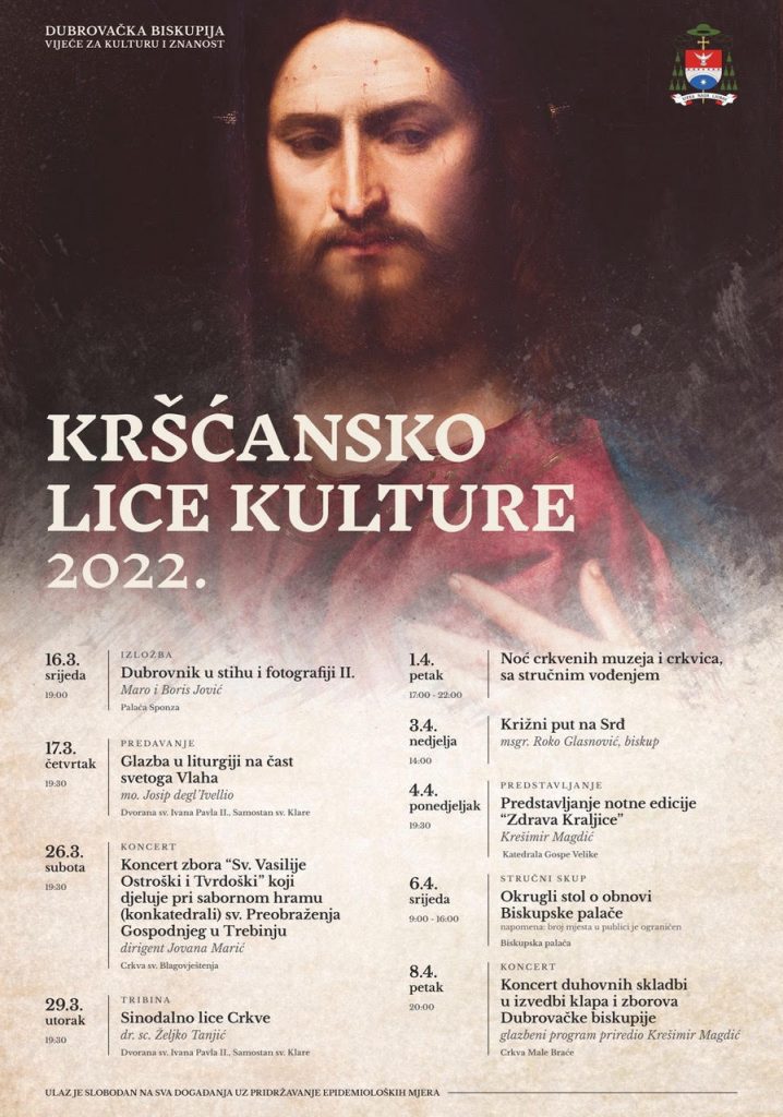 „Kršćansko lice kulture“ završava u petak, 8. travnja Koncertom duhovnih skladbi u izvedbi klapa i zborova Dubrovačke biskupije koji počinje u 20 sati u crkvi Male braće u Dubrovniku. Program koncerta priredio je Krešimir Magdić.
