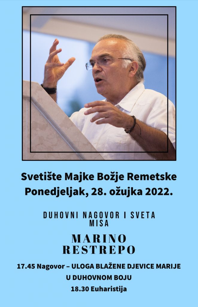 Zagreb, (IKA) – Kolumbijski katolički evangelizator Marino Restrepo imat će duhovni nagovor o temi „Uloga Blažene Djevice Marije u duhovnom boju“ u ponedjeljak 28. ožujka u 17.45 sati u svetištu Majke Božje Remetske.