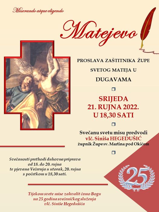 Svetkovina zaštitnika župe Dugave bit će proslavljena 21. rujna misom u 19 sati.
