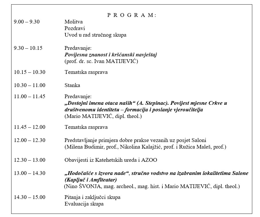 Stručni skup za sve vjeroučitelje u školi na području Splitsko-makarske nadbiskupije, Zadarske nadbiskupije, Šibenske, Dubrovačke i Hvarske biskupije održat će u subotu, 9. ožujka 2024. u hotelu Salona Palace u Solinu (Ulica don Frane Bulića 87) s početkom u 9 sati. Tema stručnog skupa je „Salona catehetica“.