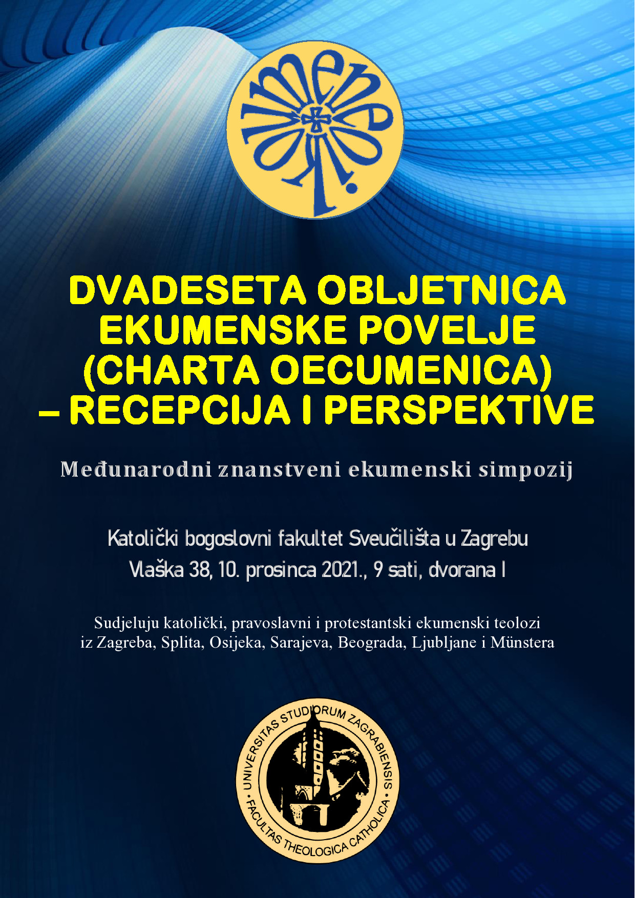 Međunarodni znanstveni ekumenski simpozij „Dvadeseta obljetnica Ekumenske povelje (Charta oecumenica) – recepcija i perspektive“ održat će se u petak 10. prosinca s početkom u 9 sati, na Katoličkom bogoslovnom fakultetu Sveučilišta u Zagrebu, Vlaška 38, dvorana I. Na Simpoziju će sudjelovati znanstvenici s područja ekumenske teologije s katoličkih, pravoslavnih i protestantskih fakulteta iz Hrvatske (Zagreb, Split, Đakovo i Osijek), Bosne i Hercegovine (Sarajevo), Srbije (Beograd), Slovenije (Ljubljana) i Njemačke (Münster).