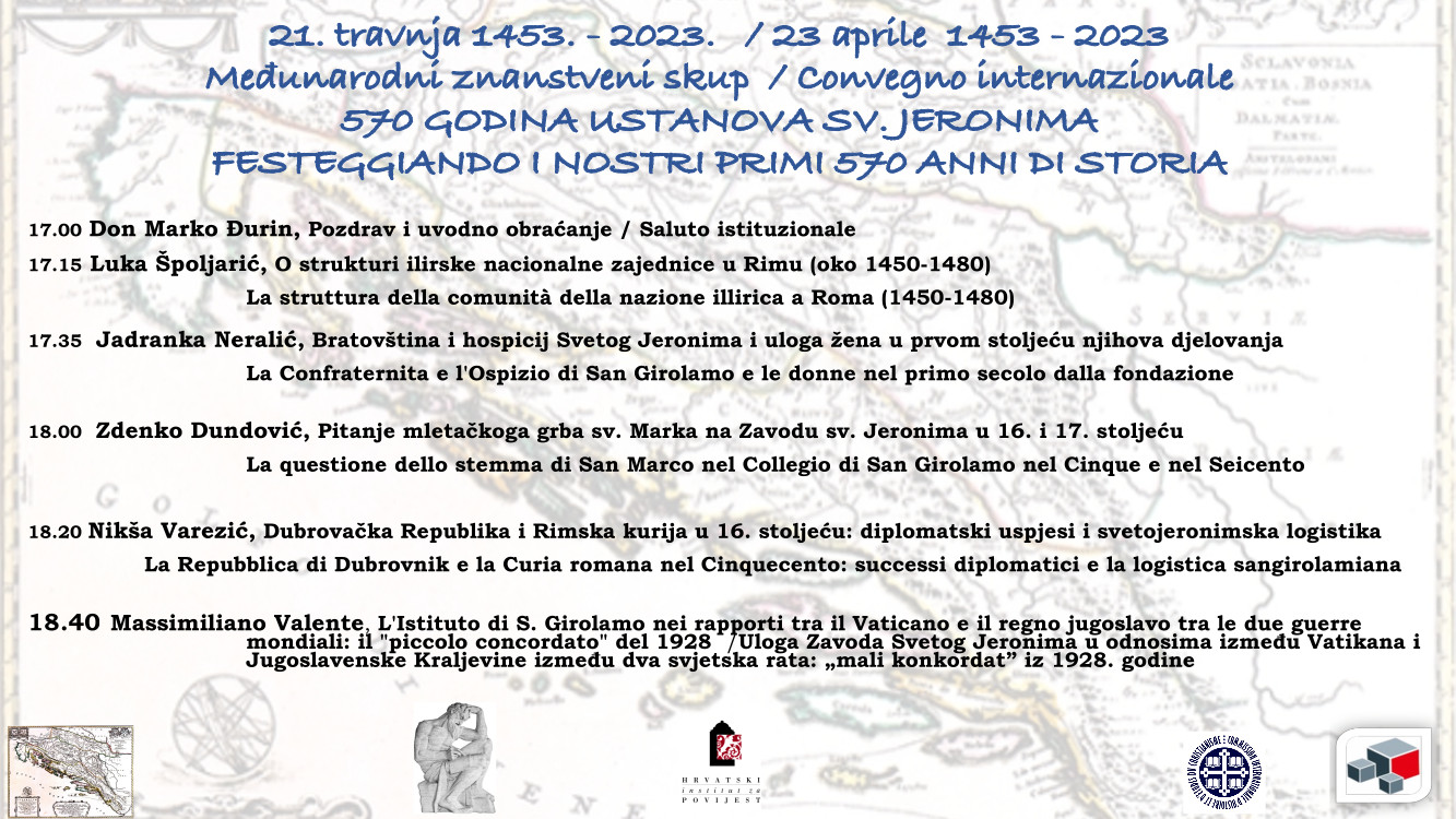 U prigodi 570. obljetnice hrvatskih rimskih ustanova sv. Jeronima (21. travnja 1453. – 21. travnja 2023.), u petak 21. travnja s početkom u 17 sati u prostorijama Papinskog hrvatskog zavoda sv. Jeronima u Rimu održat će se međunarodni znanstveni kolokvij pod nazivom „570 godina ustanova sv. Jeronima – 21. travnja 1453. – 2023.“