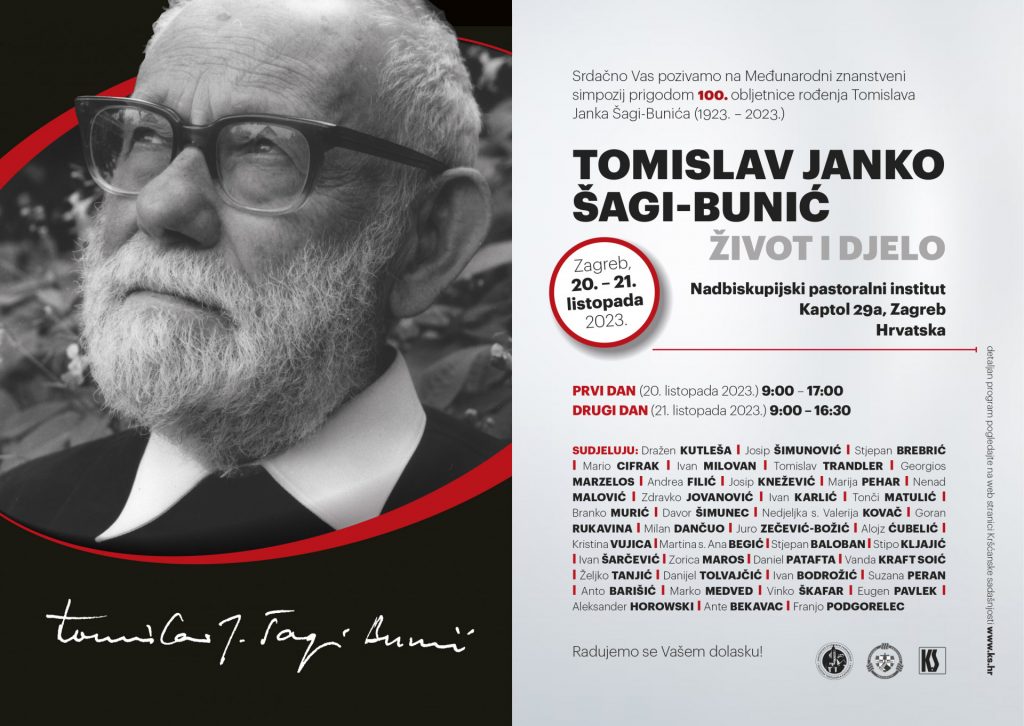 Međunarodni znanstveni simpozij prigodom 100. obljetnice rođenja Tomislava Janka Šagi-Bunića bit će održan 20. i 21. listopada 2023. u dvorani „Vijenac“ Nadbiskupijskoga pastoralnog instituta u Zagrebu.