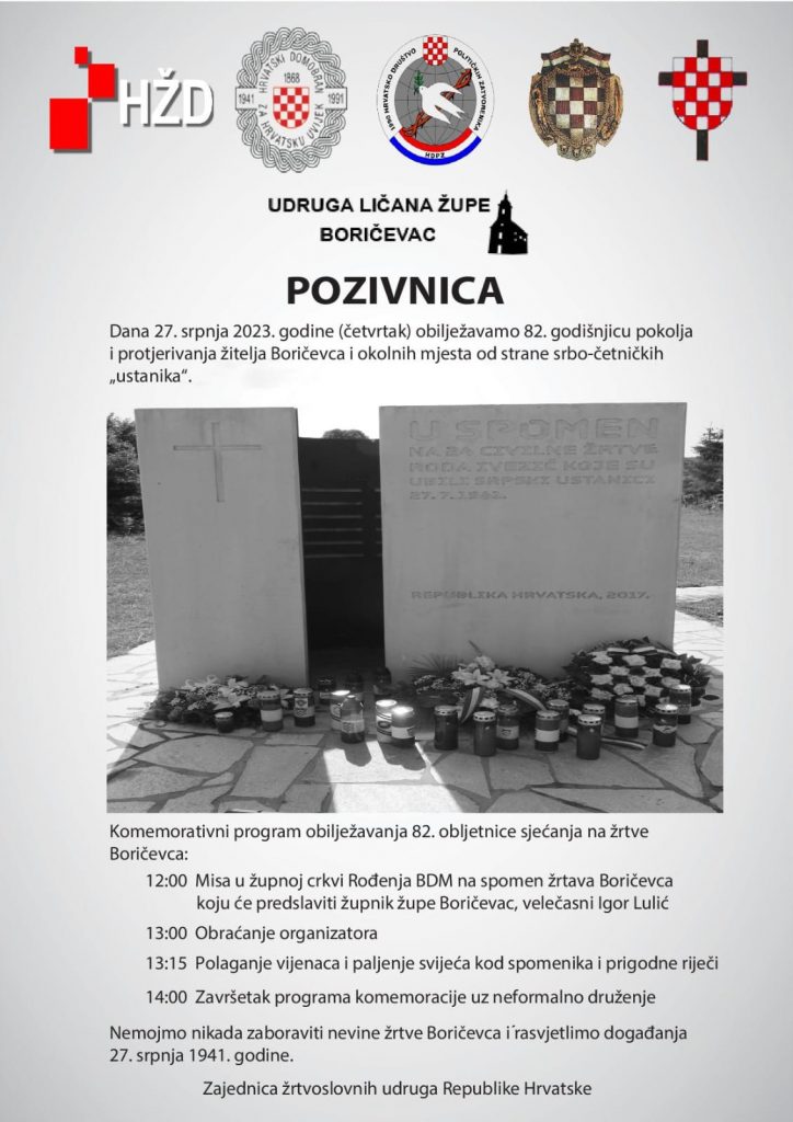 Misa u povodu 82. godišnjice pokolja i protjerivanja žitelja Boričevca bit će slavljena u četvrtak 27. srpnja 2023. u župnoj crkvi Rođenja Blažene Djevice Marije. Misu će predslaviti domaći župnik Igor Lulić.