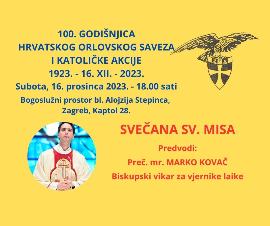 Zagreb, (IKA) – U povodu 100. obljetnice osnivanja Hrvatskoga orlovskog saveza i Katoličke akcije svečanu misu u subotu, 16. prosinca u 18 sati u bogoslužnom prostoru bl. Alojzija Stepinca u Zagrebu predvodit će preč. mr. Marko Kovač, biskupski vikar za vjernike laike.