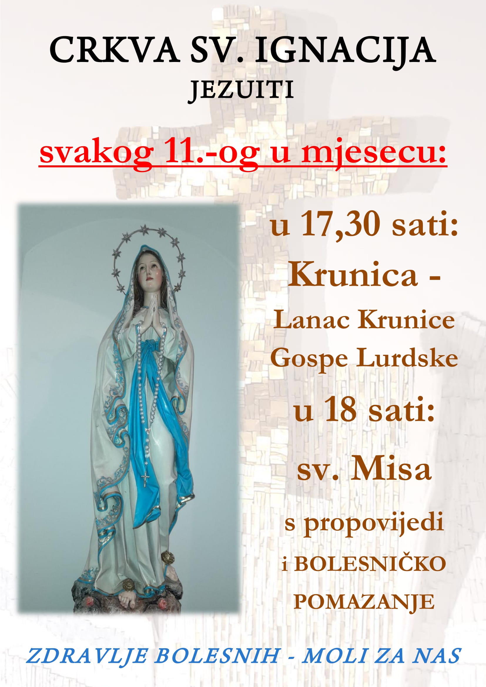 U crkvi Sv. Ignacija u Dubrovniku svakog 11-og u mjesecu u 18 sati bit će slavljena misa za bolesnike.
