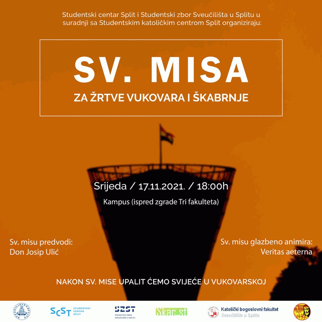 Studentski centar Split i Studentski zbor Sveučilišta u Splitu u suradnji sa Studentskim katoličkim centrom (SKAC) Split u srijedu 17. studenog 2021. organiziraju slavlje mise za sve nevine žrtve Vukovara i Škabrnje.
