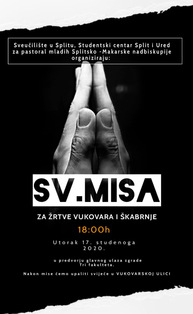 U organizaciji Sveučilišta u Splitu, Studentskog centra Split, Ureda za pastoral mladih SMN i Splitsko makarske nadbiskupije organizira se misa za sve žrtve Vukovara i Škabrnje.