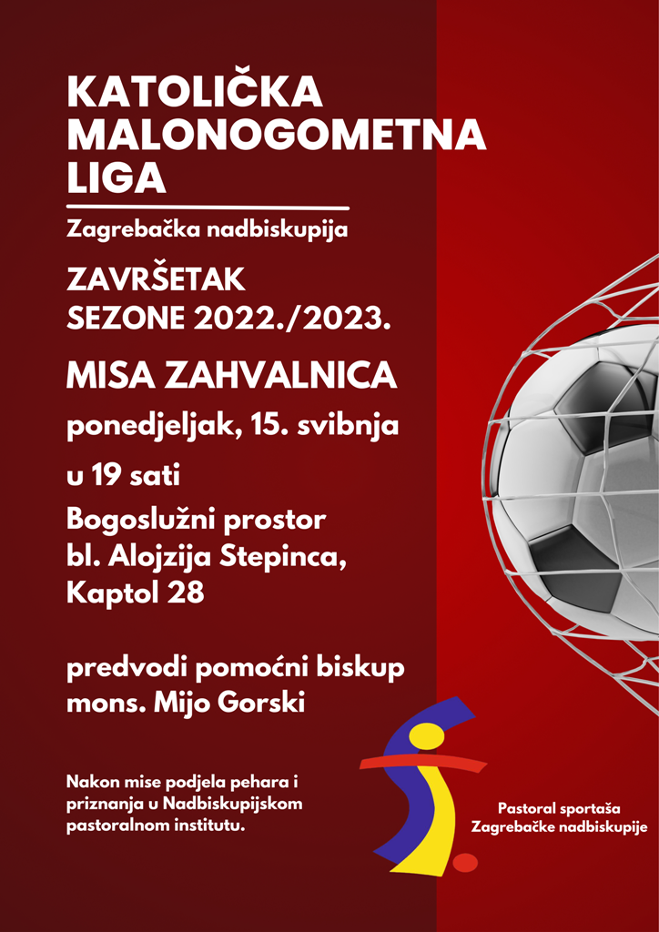 Zagreb, (IKA) – Misa zahvalnica za Katoličku malonogometnu ligu Zagrebačke nadbiskupije na završetku sezone 2022./2023. slavit će se u ponedjeljak 15. svibnja u 19 sati u Bogoslužnom prostoru bl. Alojzija Stepinca, Kaptol 28.