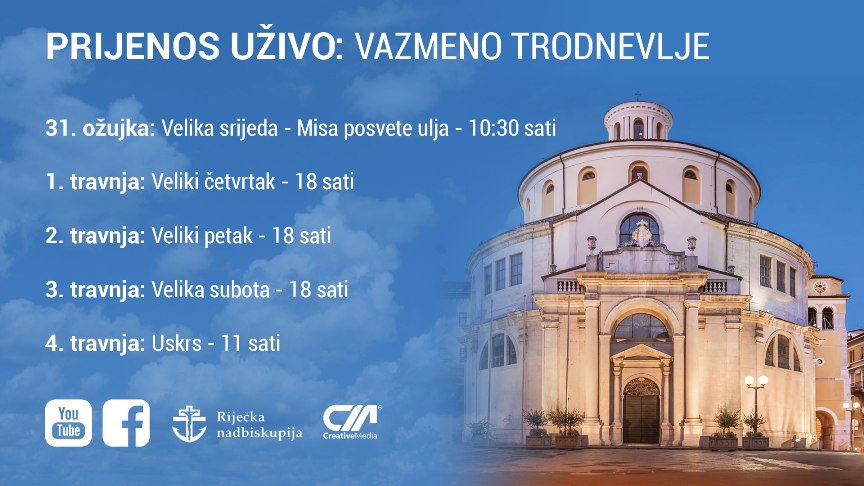 Zbog velikog zanimanja vjernika i preporuka Stožera civilne zaštite, mise i obredi Velikoga tjedna i Uskrsa, koje će u katedrali sv. Vida u Rijeci predvoditi riječki nadbiskup Ivan Devčić, moći će se pratiti u izravnom prijenosu na Facebook stranici i Youtube kanalu Riječke nadbiskupije.