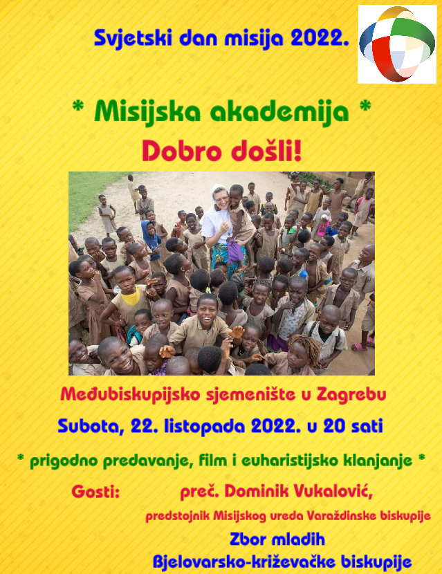 Zagreb, (IKA) – Misijska akademija u prigodi 96. svjetskog dana misija održat će se u subotu 22. listopada u 20 sati u svečanoj dvorani Međubiskupijskog sjemeništa u Zagrebu u organizaciji Ravnateljstva Papinskih misijskih djela u Zagrebačkoj nadbiskupiji.
