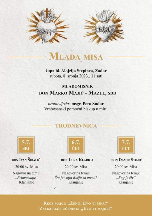 Zadar, (IKA) – Don Marko Majić Mazul, SDB, slavi svoju mladu misu u subotu, 8. srpnja u župnoj crkvi bl. Alojzija Stepinca na Bilom Brigu u Zadru s početkom u 11 sati. Na misi propovijeda mons. Pero Sudar, vrhbosanski pomoćni biskup u miru.